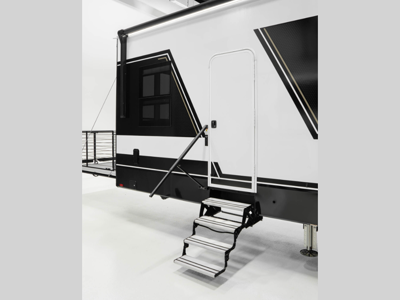 Unmatched luxury, an automotive exterior, tons of storage space, and intelligent features; it has to be a Model G toy hauler fifth wheel by Brinkley!