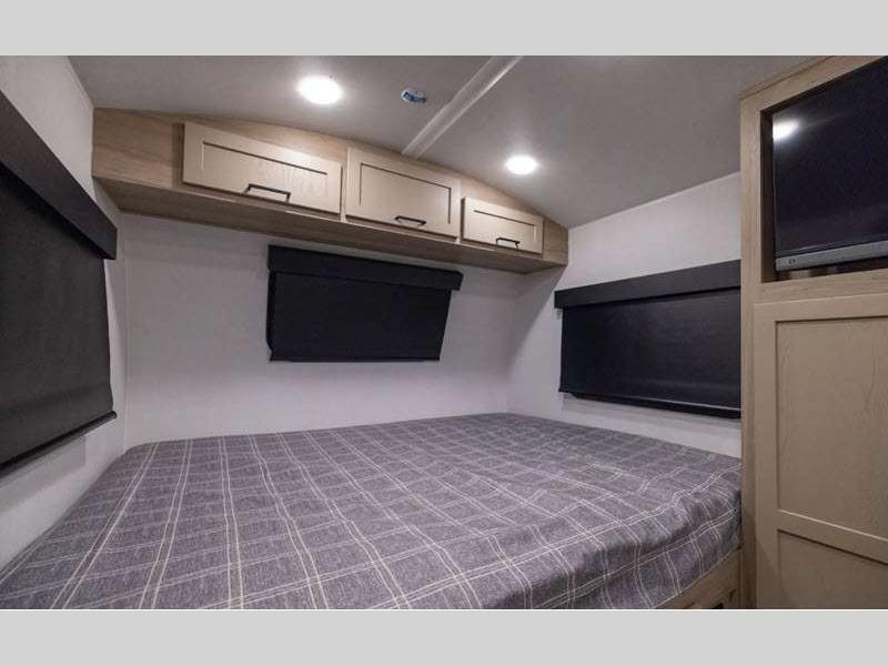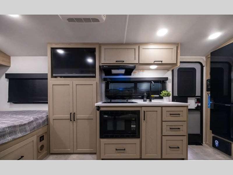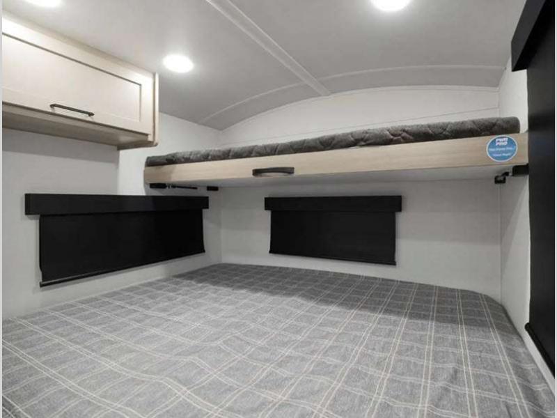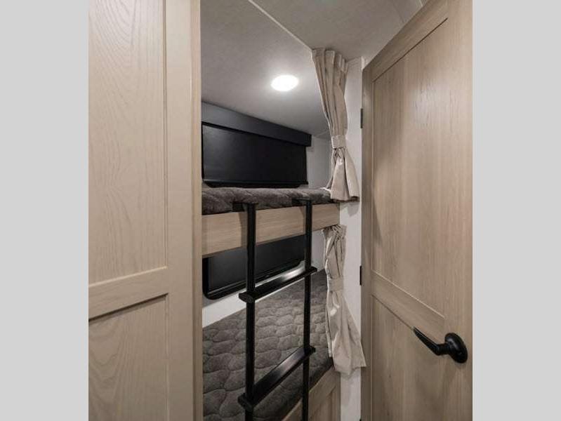 Sleeps 5 Slides 1 Length 21 ft 2 in Ext Width 7 ft 8 in Ext Height 10 ft 4 in Hitch Weight 501 lbs Dry Weight 3843 lbs Cargo Capacity 1155 lbs Fresh Water Capacity 31 gals Grey Water Capacity 27 gals Black Water Capacity 27 gals Furnace BTU 20000 btu Number Of Bunks 2 Available Beds Full Refrigerator Type 12V Convection Cooking Yes Cooktop Burners 3 Number of Awnings 1 LP Tank Capacity 20 lbs Water Heater Type Gas/Electric AC BTU 13500 btu TV Info 12V Smart TV Awning Info 14' Power Axle Count 1 Number of LP Tanks 2 Shower Type Standard Solar Wattage 200 watts Similar Floorplans