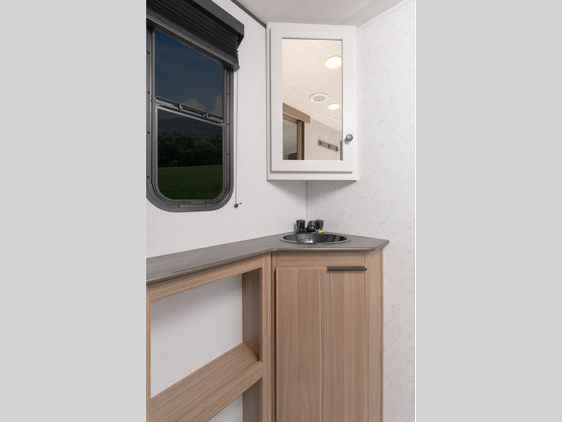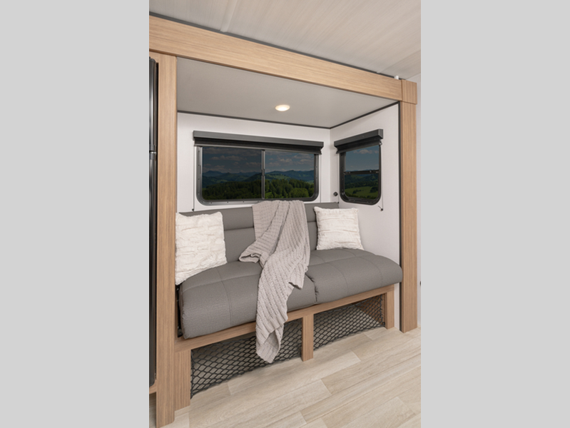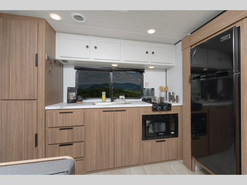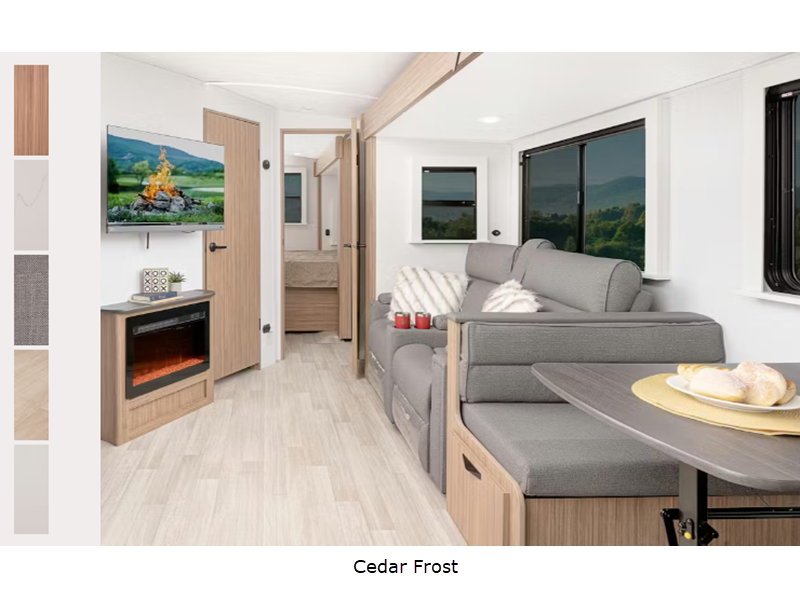 Sleeps 4 Length 21 ft 11 in Ext Height 10 ft 5 in Interior Color Cedar Frost Hitch Weight 400 lbs Dry Weight 3640 lbs Cargo Capacity 1160 lbs Fresh Water Capacity 37 gals Grey Water Capacity 30 gals Black Water Capacity 30 gals Tire Size ST235/75R15C Furnace BTU 20000 btu Available Beds Queen Refrigerator Type Large Double Door 12V Refrigerator Size 8 cu ft Cooktop Burners 2 Number of Awnings 1 LP Tank Capacity 20 lbs Water Heater Type Girard Tankless AC BTU 13500 btu Axle Count 1 Number of LP Tanks 1 Shower Type Standard Similar Floorplans